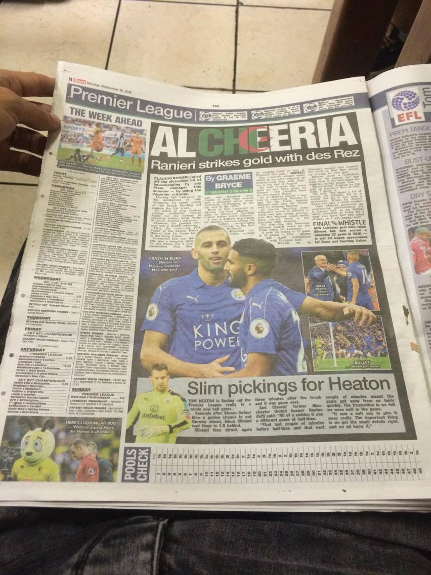 «C'est important que Slimani continue de marquer parce que s'il ne marque que pour son premier match, nous avons un problème. C'est un bon garçon et les fans sont vraiment très contents», a expliqué l'ancien entraîneur de l'AS Monaco à l'issue de la rencontre. Après un début de saison compliqué, le champion sortant semble enfin s'être mis sur les bons rails. Une neuvième place à trois points de la troisième place. Apparemment, les décideurs de Leicester ne se sont pas trompés sur Slimani. «C'était bon pour Slimani et pour tout le monde. Nous l'avons recruté pour toutes les qualités qu'il a montrées, il a créée du liant et a pressé si fort tout au long du match», s'est félicité Ranieri.«Très heureux du résultat et de la prestation des joueurs. Après une victoire en Europe, c'était important d'enchaîner en Premier League. Nous avons bien joué et nous avons marqué trois fois. Slimani a mis deux buts, nous nous sommes battus. Je crois que les fans rentreront chez eux satisfaits. C'était important de faire le plein de confiance après Liverpool. Nous avons gagné contre Bruges, aujourd'hui contre Burnley, maintenant nous sommes prêts pour Chelsea», a-t-il expliqué. Après le championnat du Portugal, Islam Slimani mettra-t-il la Premier League à ses pieds? Le temps le dira, mais ça semble bien parti. L'attaquant international algérien Islam Slimani a inscrit avant-hier contre Burnley un doublé pour son premier match officiel en championnat d'Angleterre, où il défend les couleurs de Leicester City, qu'il a rejoint cet été en provenance du Sporting Lisbonne (Portugal). L'ancien fer de lance du CR Belouizdad (28 ans) a commencé par ouvrir le score d'une belle tête à la 45e minute avant de revenir à la charge à la 48e pour s'offrir le doublé. Complètement assommé, le nouveau promu en Premier League a concédé un troisième et dernier but, inscrit par Mee contre son camp, après un centre de l'autre international algérien des «Foxes» Ryad Mahrez (3-0). Slimani, qui a rejoint le champion d'Angleterre en titre pendant les dernières heures du mercato estival avait fait ses débuts avec Leicester mercredi dernier, à l'occasion de la première journée de la Ligue des champions, ayant vu son équipe l'emporter (3-0) contre les Belges du FC Bruges, mais son entraîneur, Claudio Ranieri, ne l'avait pas retenu pour le déplacement à Liverpool, en championnat d'Angleterre (défaite 1-4). L'ancien Belouizdadi a donc dû attendre cette 5e journée de Premier League et la réception de Burnley au King Power Stadium, pour faire ses débuts en championnat, et il les a parfaitement bien réussis en signant ce doublé contre Burnley. Slimani s'est engagé avec Leicester City pour cinq ans, contre un chèque de 30 millions d'euros (plus 5 millions de bonus).